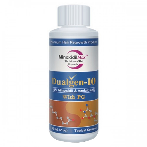 Миноксидил 10% (Dualgen) относится к высоким концентрациям миноксидила. В состав дуалгена дополнительно входит 5% азелаиновая кислота, которая является антиандрогеном. Азелаиновая кислота снижает чувствительность волосяных фолликул к гормонам-андрогенам, что актуально для мужчин с андрогенной алопецией (с облысением по мужскому типу).